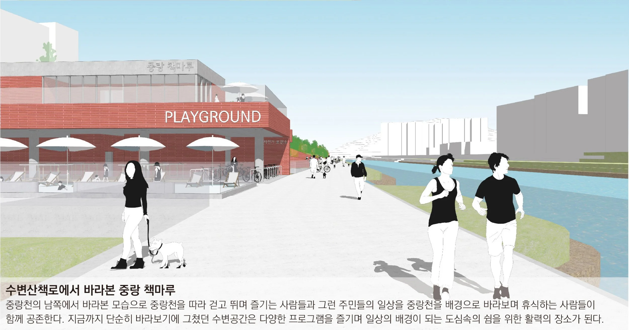 중랑천을 따라 이어지는 수변공간은 오랜시간동안 주민들의 건강과 활력을 책임지고 있었다. 하지만 제방상부와의 연계부족, 구체적인 프로그램의 부족등으로 활성화되기 어려운 부분들이 있어 이러한 수변활력거점을 통해 주민들의 니즈를 충족하며 볼거리, 즐길거리가 공존하는 활력의 장소를 만들고자 한다.