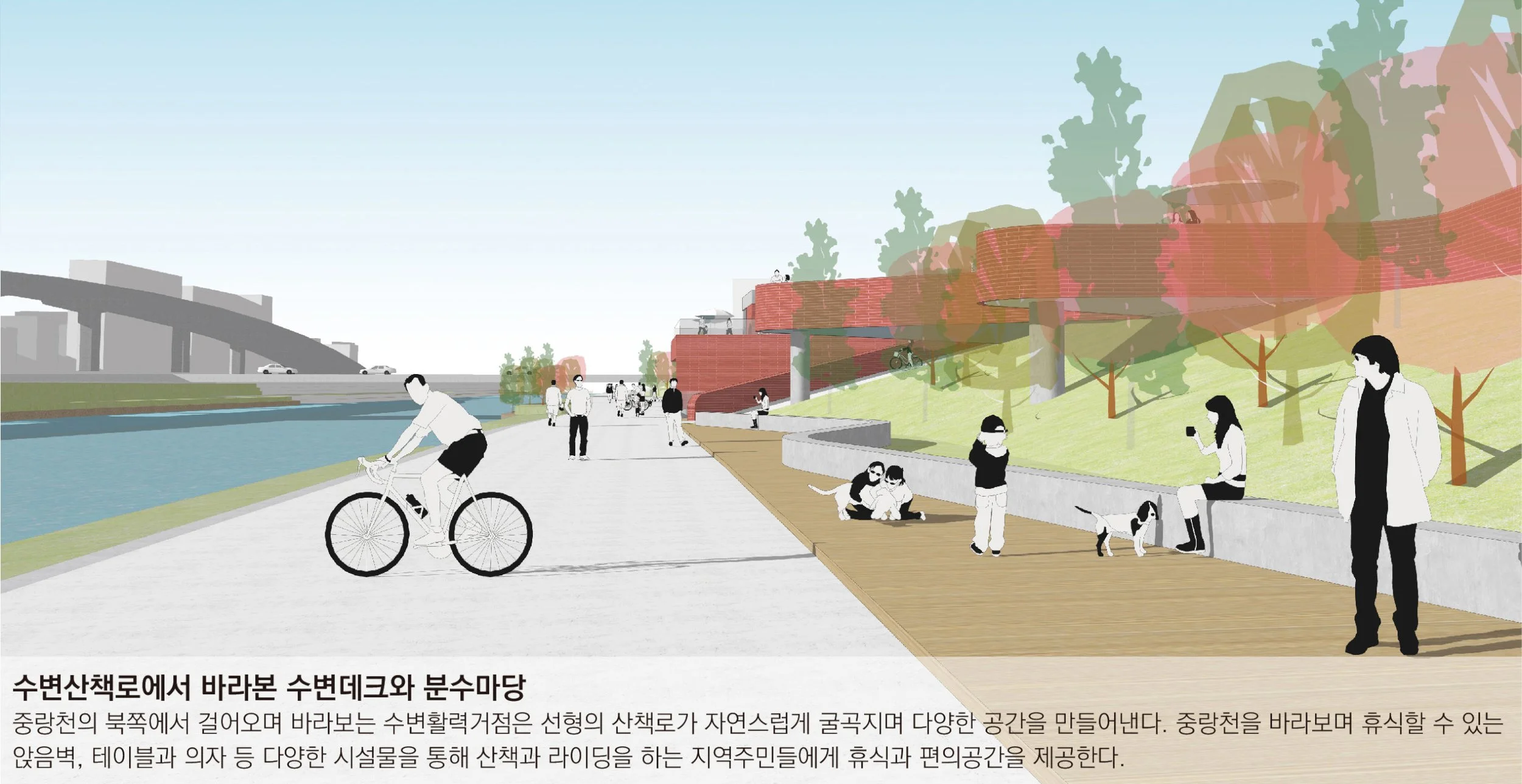 대상지의 중랑천과 무수천변으로 둔치길이 형성되어 걷기, 라이딩, 생활체육등 동적인 활동이 이루어지고 있다. 기존의 동적인 프로그램과 연계된 스포츠테마존을 계획하여 동적인 기능이 좀더 극대화될 수 있도록 하며, 수변을 따라 데크공간을 계획하여 정적인 휴식이 필요한 이에게 중랑천을 바라보며 휴식할 수 있는 선택적 프로그램을 제안한다.