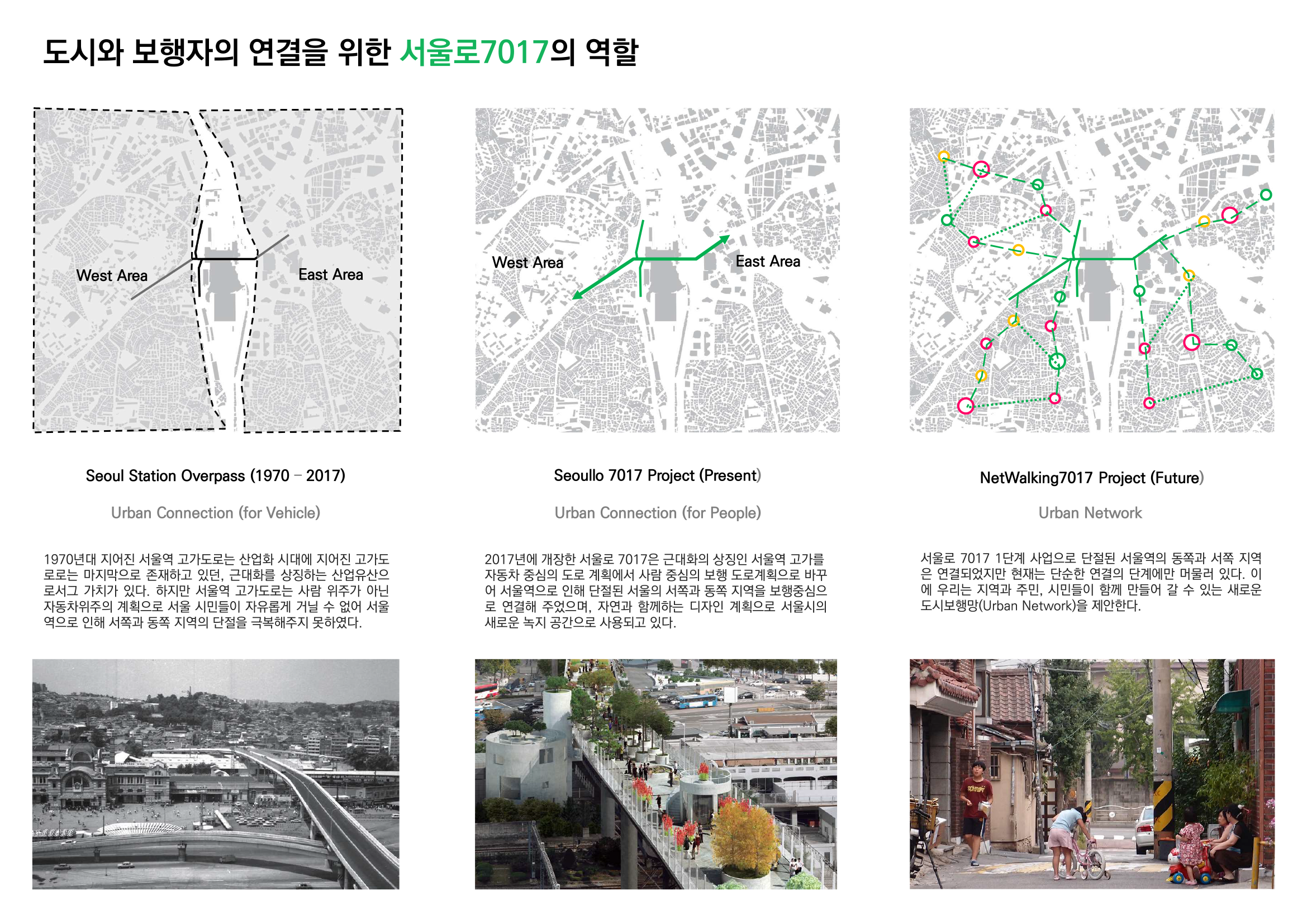 서울의 도시 계획은 보행자 중심의 계획이 아닌 차량중심의 계획으로 이루어져 있다. 이로 인해 서울시에는 다양한 자연, 문화의 요소가 존재하지만, 이러한 요소들이 유기적으로 연결이 되지 못한 독립적으로 남아있다.이에 우리는 서울시의 차량중심 보행 체계를 서울로7017을 중심으로 한 보행중심 계획으로 바꾸어 서울역 주변 지역과 자연을 유기적으로 연결해 줄 것이다.