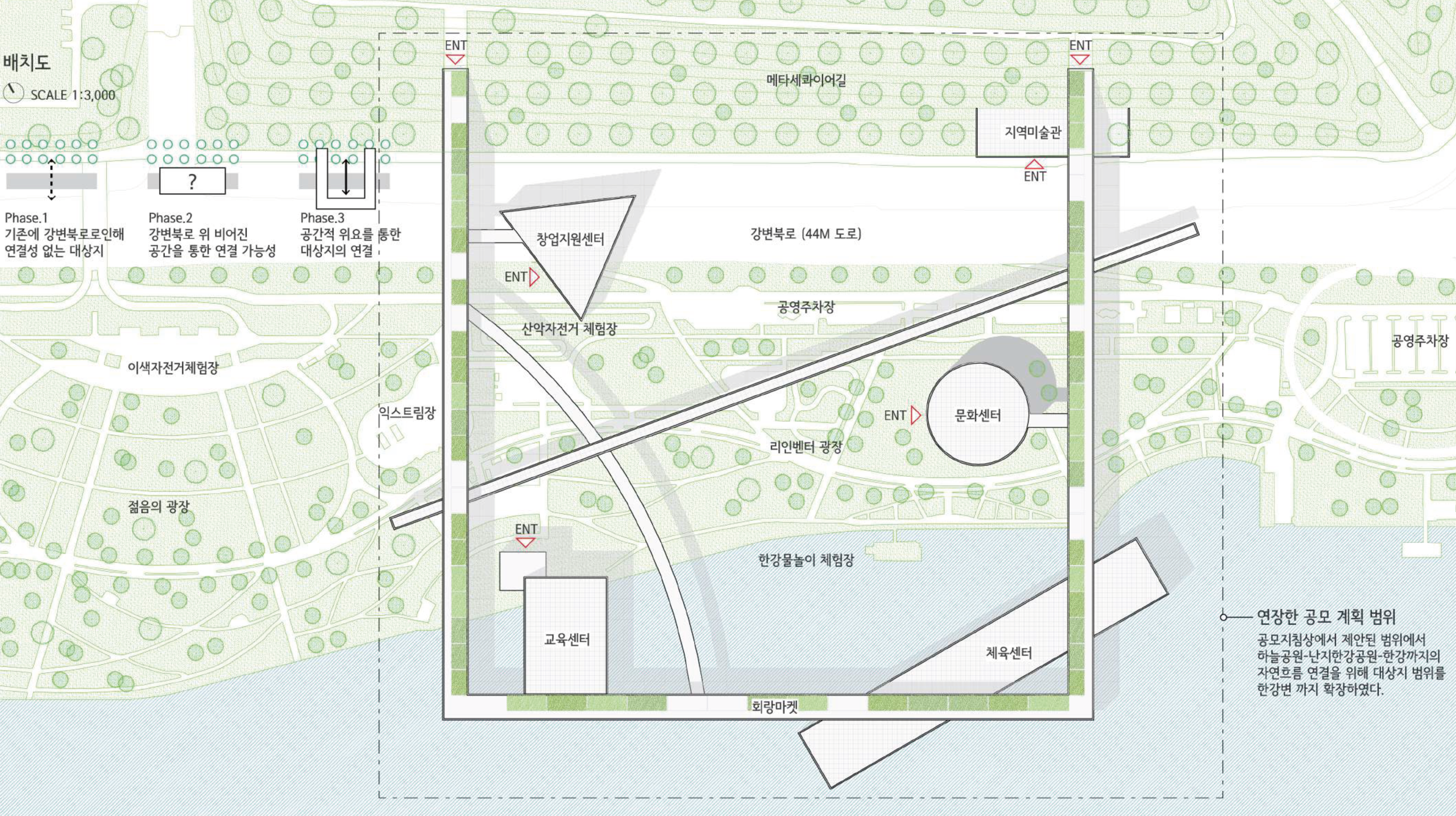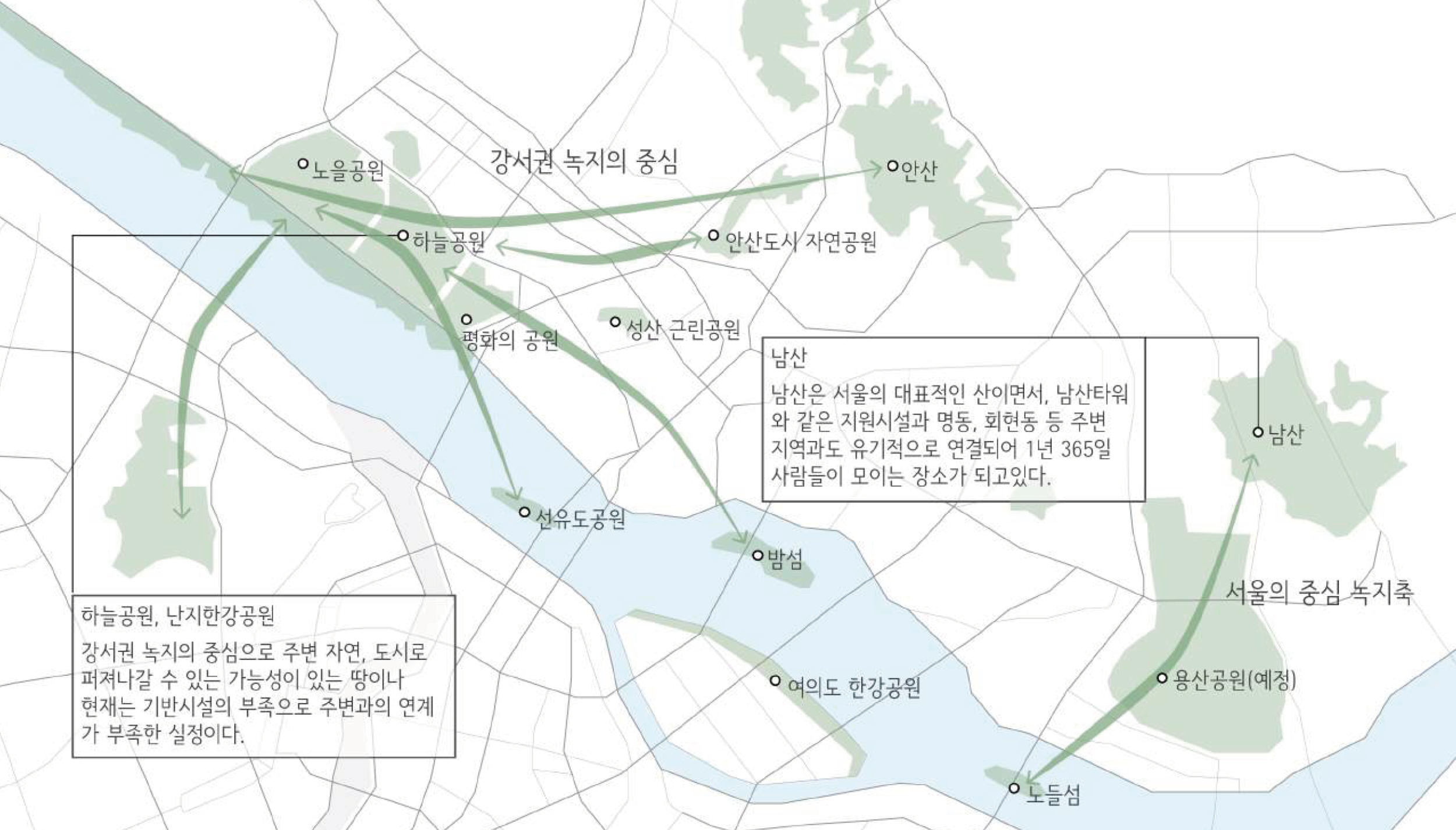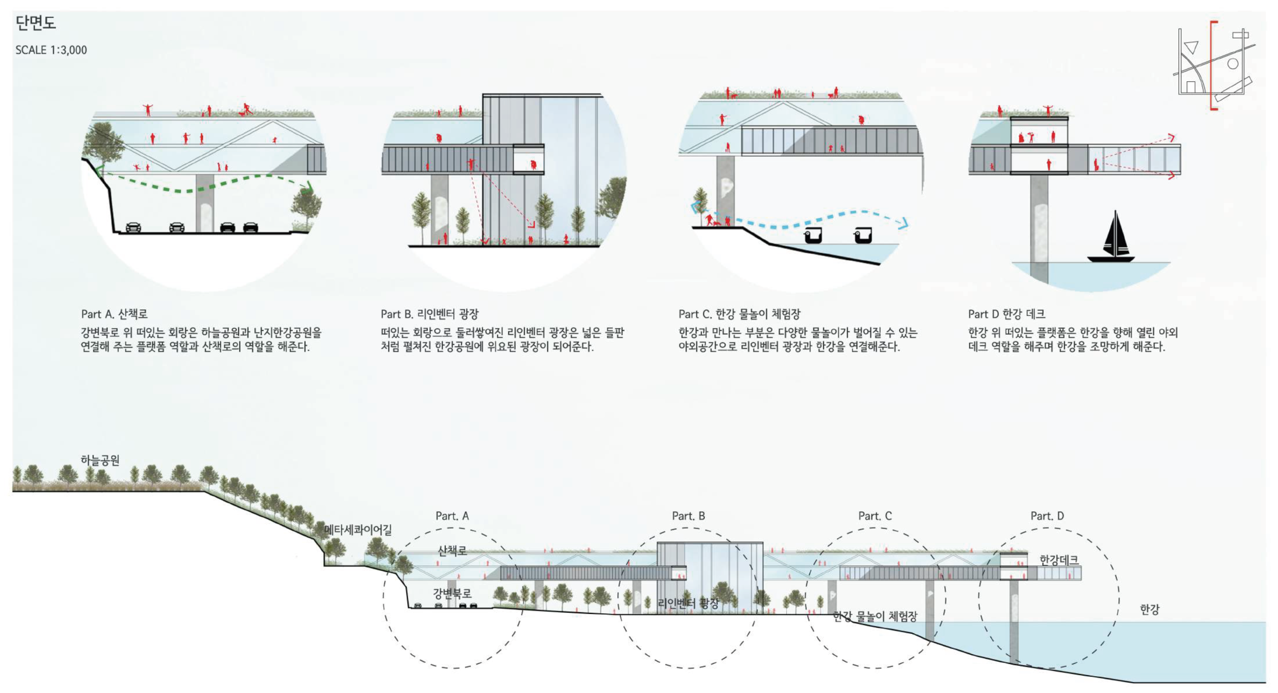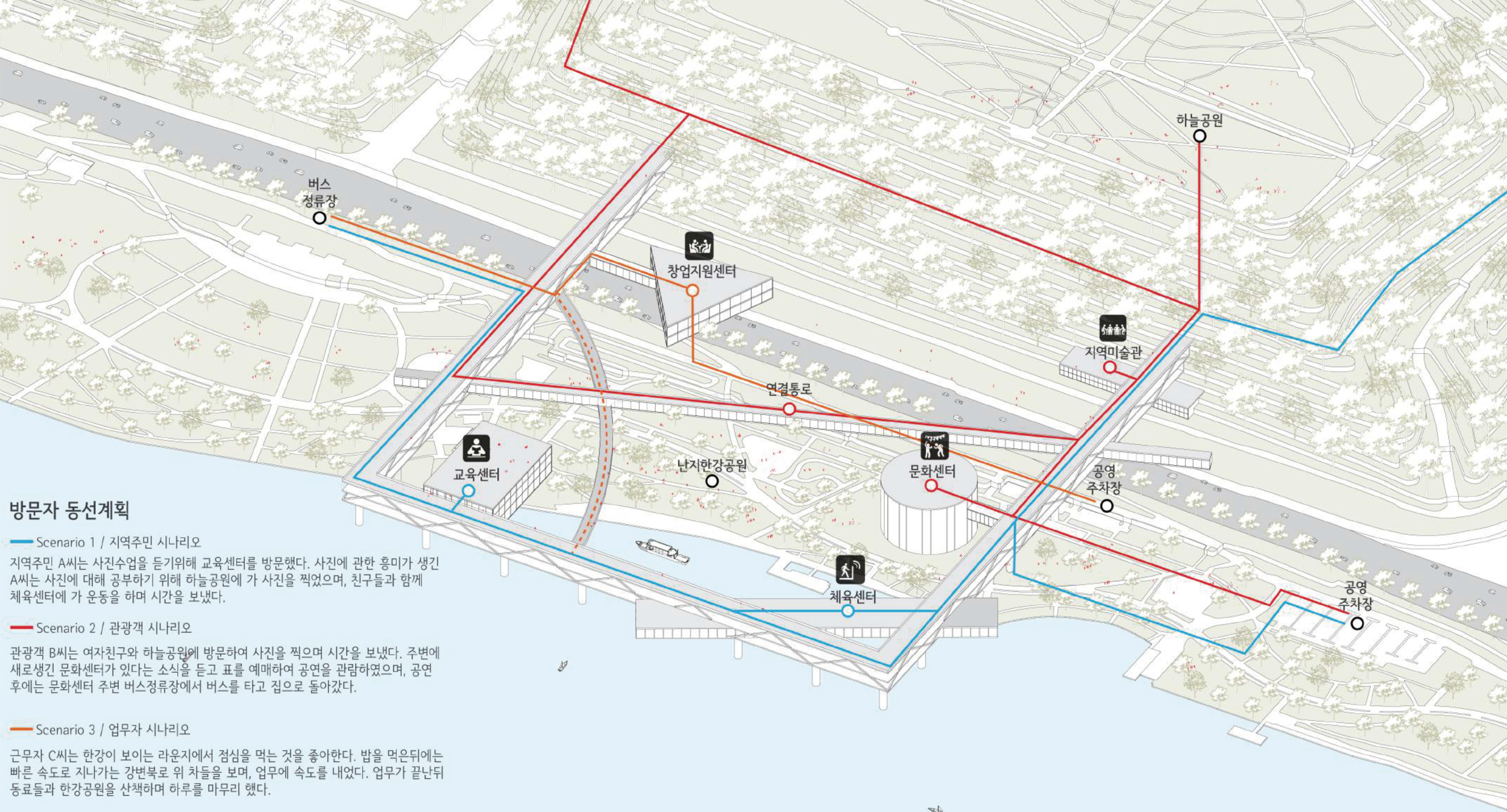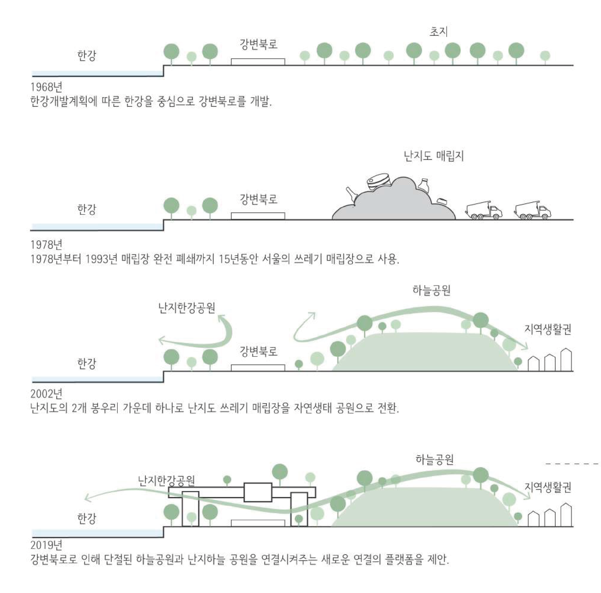 기존 도시기반시설인 강변북로 위 새롭게 더해지는 플랫폼은 강변북로로 인해 하늘공원-난지한강공원이 단절돼 있는 현재 상황에 대한 물리적인 연결 뿐만 아니라 도시적 관점에서의 도시와 한강과의 연계, 획일화되고, 파편적으로 존재하는 프로그램의 확장과 연계를 위한 새로운 제안이 필요할 것이다.