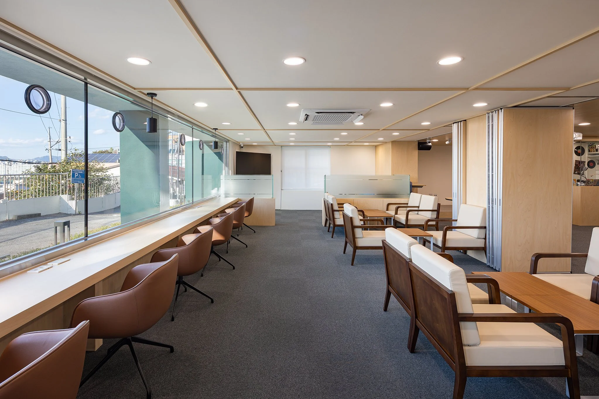 오픈플랜으로 구성된 공간의 중심에는 무빙월을 배치해 필요에 따라 공간을 유연하게 사용할 수 있도록 했으며, 천장 마감의 변화를 통해 영역별 분위기를 자연스럽게 달라지도록 계획했다. 전면부에는 프레임을 최소화한 창호와 바 테이블을 함께 구성하여, 이용자들이 한강과 하늘을 바라보며 편히 쉬어갈 수 있는 공간으로 계획하였다.