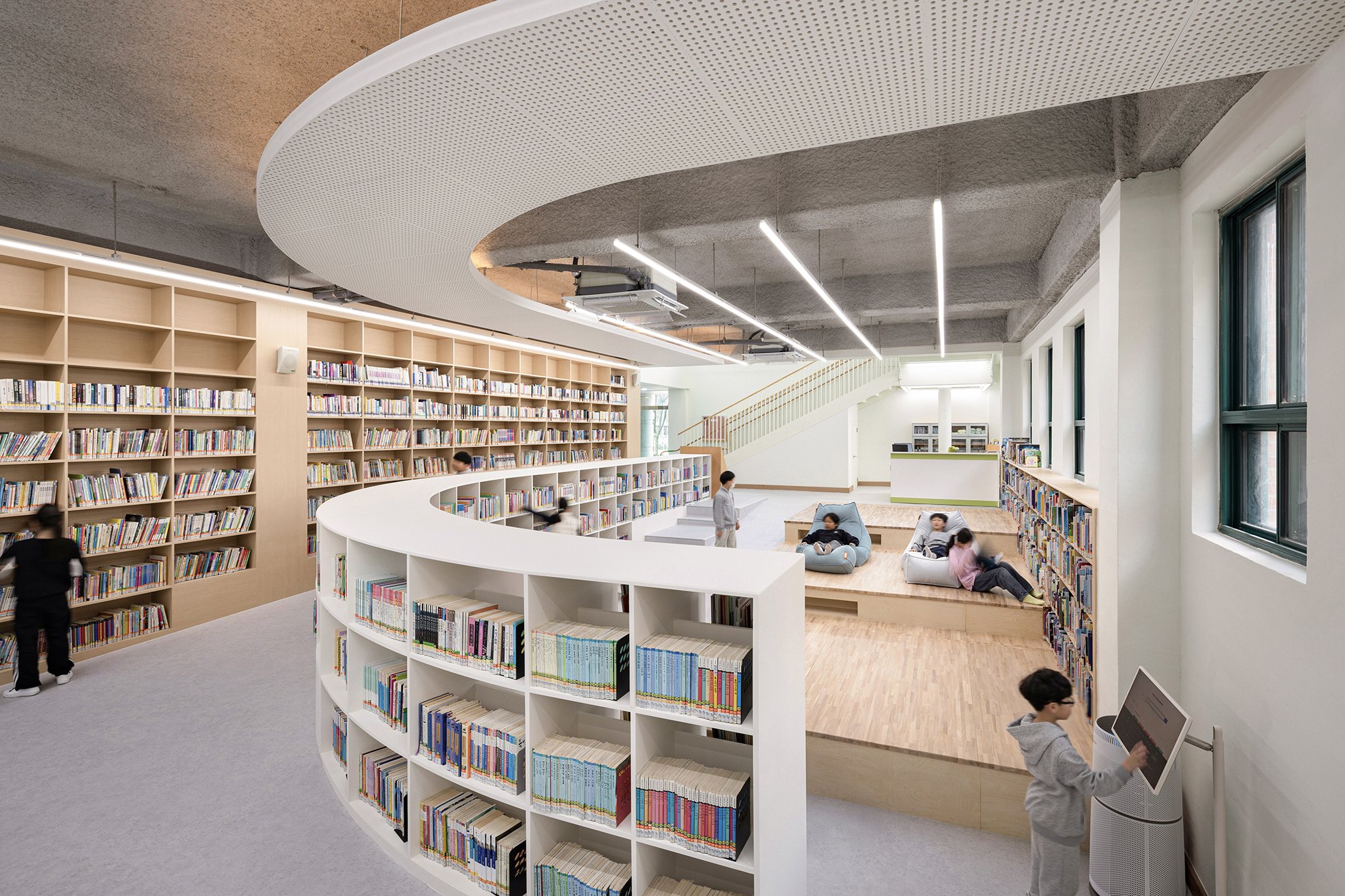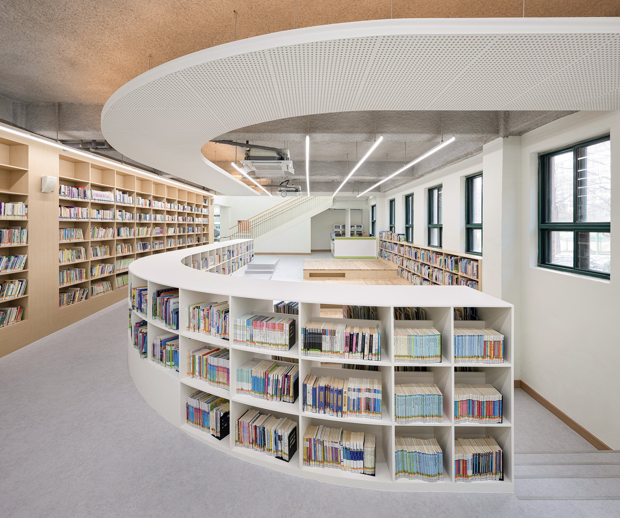 기존 시청각실은 무대와 고정식 객석을 위해 타설된 계단 모양의 콘크리트 바닥이 형성되어 있었으며 본 계획에서는 이러한 기존 구조를 적극적으로 활용하는 방향을 설정하였다. 무대를 향하던 시선 흐름을 공간 구성의 주요 개념으로 재해석하고 곡선형 서가를 공간의 중심에 계획해 흐름을 자연스럽게 이어가고자 하였다. 곡선형 서가는 공간을 자연스럽게 구분하고 안쪽 공간에 위요감있는 놀이공간으로 형성해 학생들이 자연스럽게 머무르고 활동할 수 있도록 하였다.