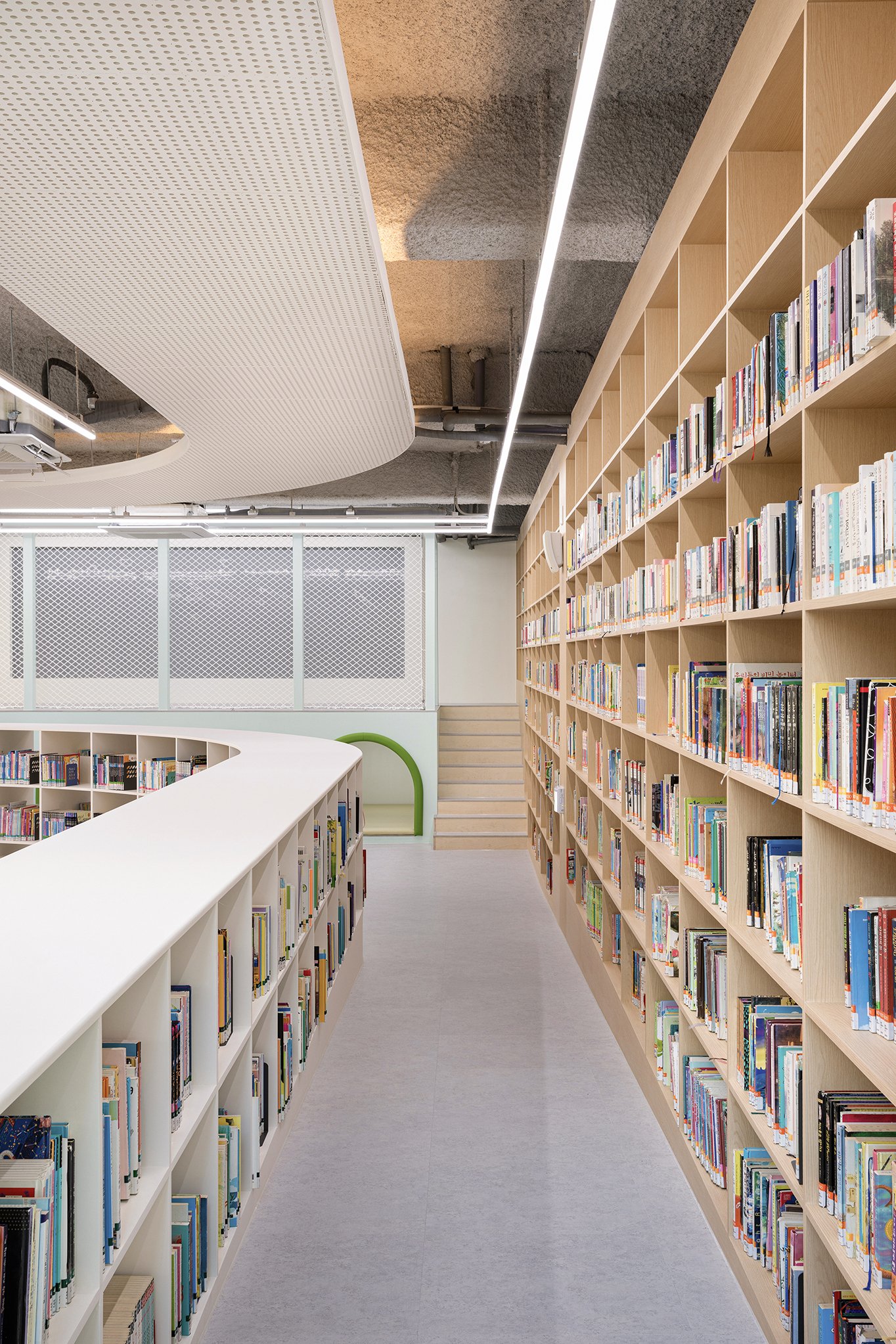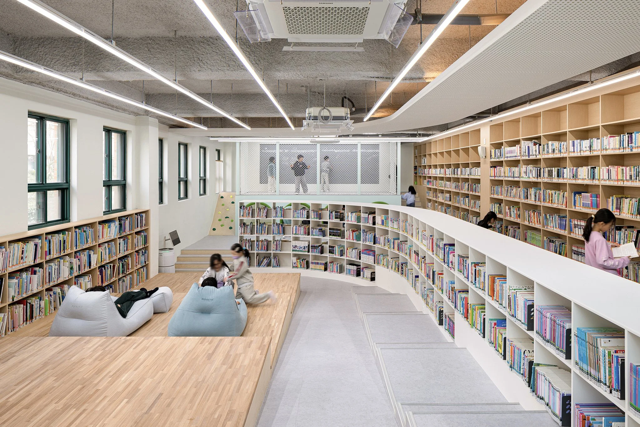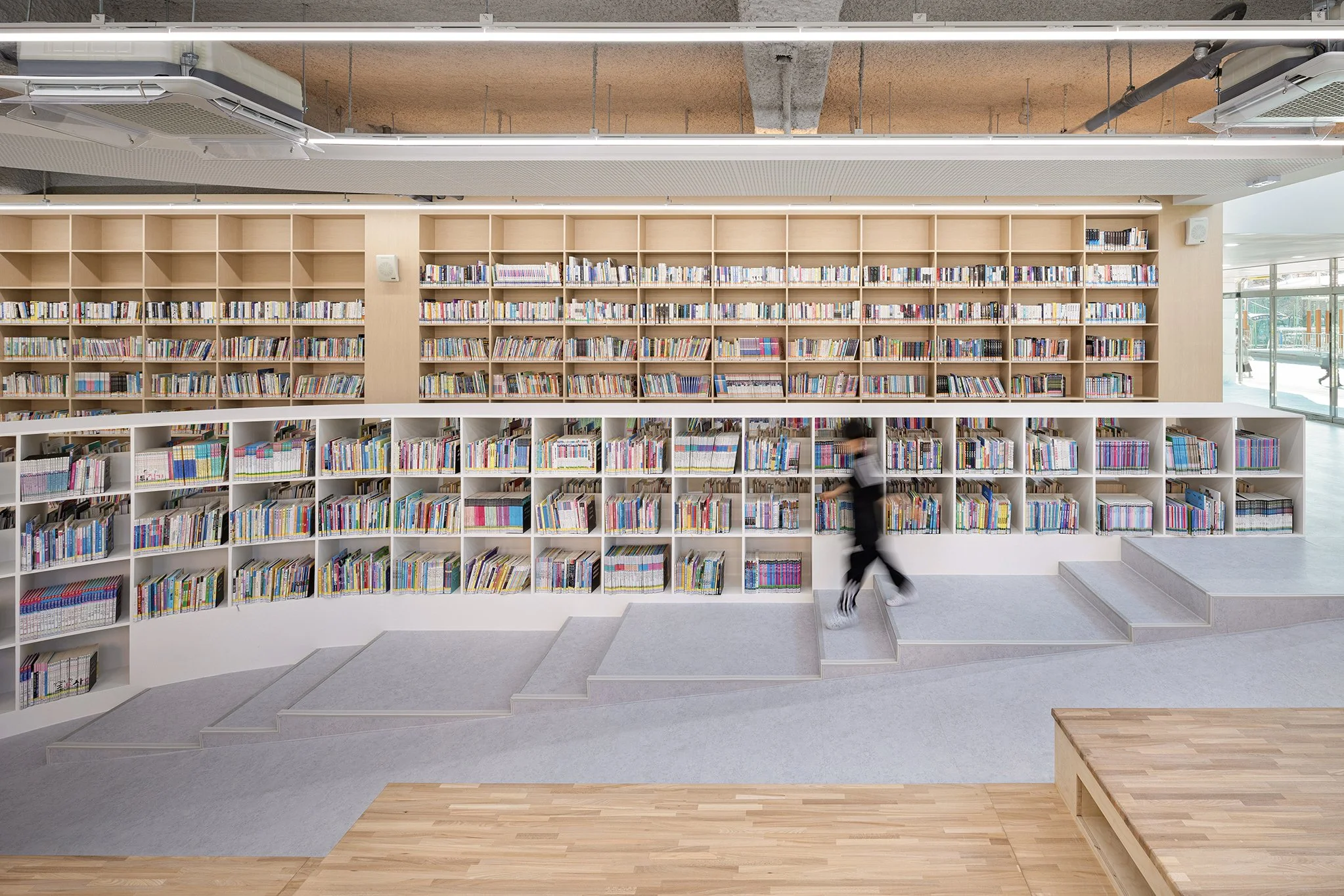프로그램 구성에 있어서는 1층을 서가 중심의 개방형 열람 및 놀이 공간과 소음 허용 열람 공간으로 계획하고, 2층은 수업 및 집중 열람이 가능한 정숙 공간으로 구성하였다. 도서관의 이용 행태에 따른 층별 공간 분리는 효율적인 운영과 더불어 아이들에게 학교에서 경험하기 어려운 입체적인 공간감을 제공한다.