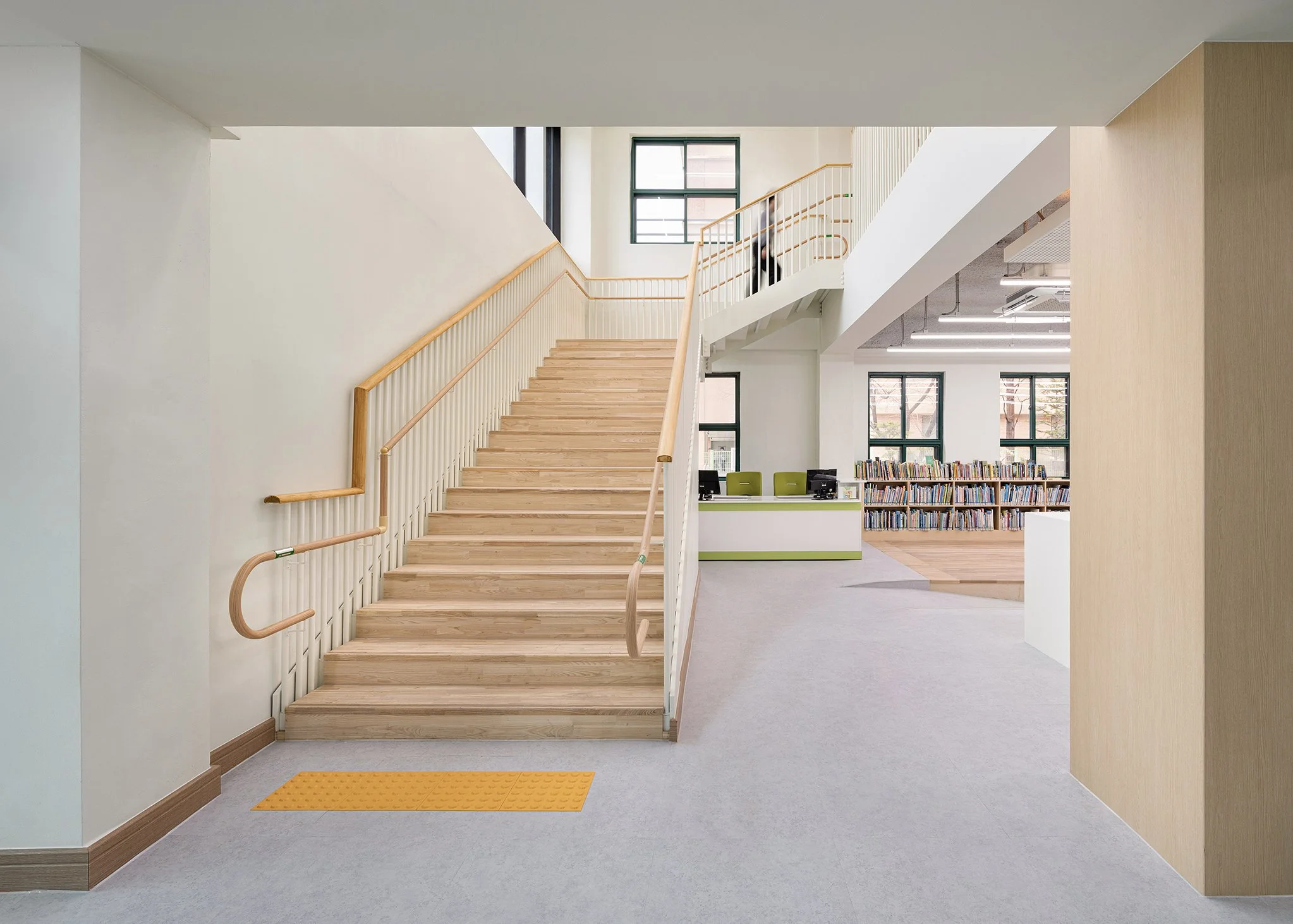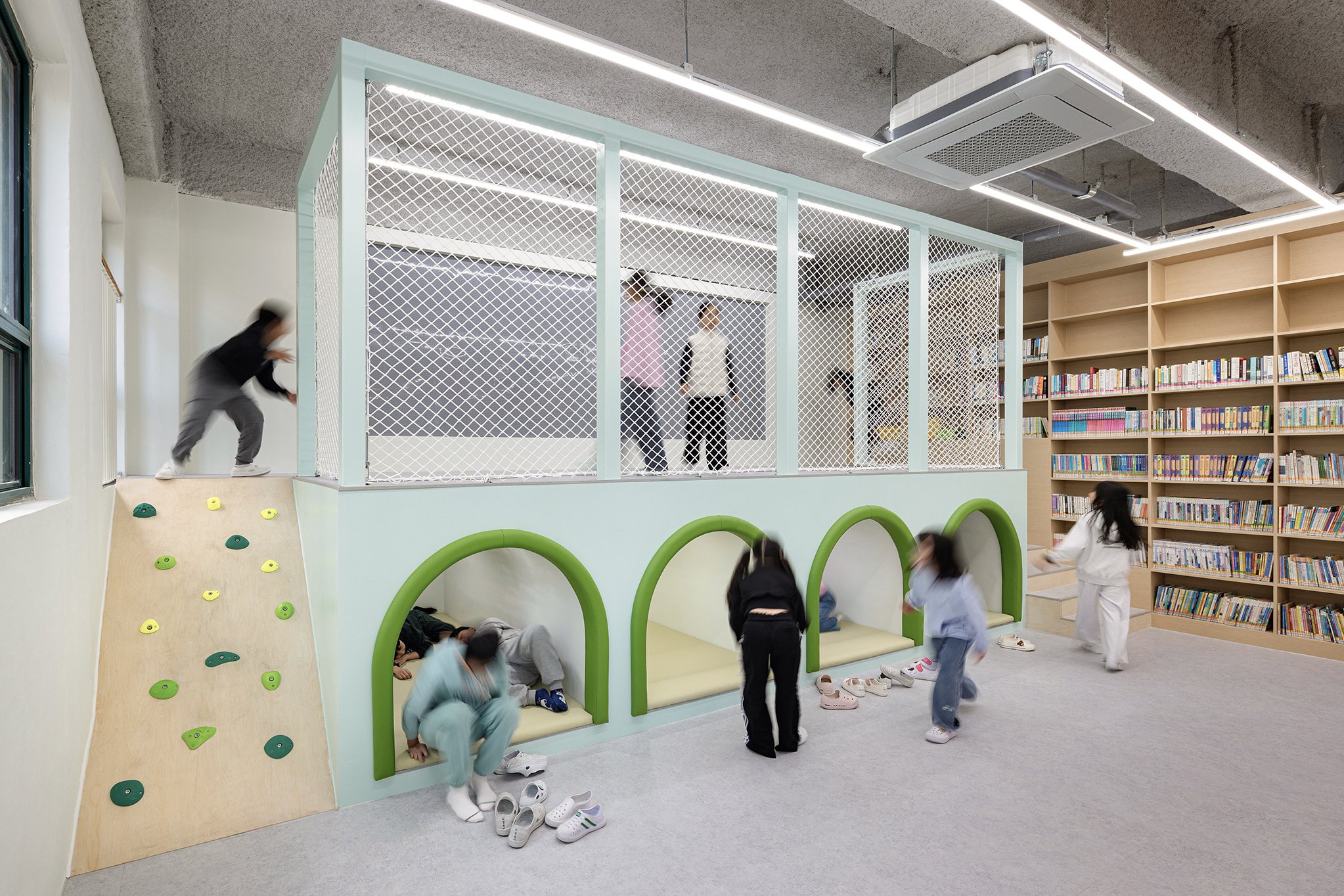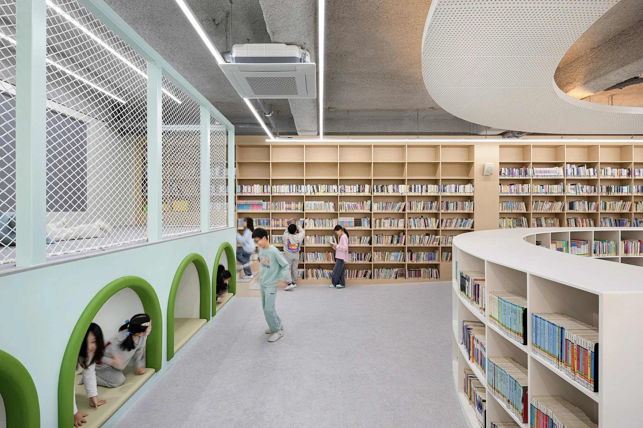 프로그램 구성에 있어서는 1층을 서가 중심의 개방형 열람 및 놀이 공간과 소음 허용 열람 공간으로 계획하고, 2층은 수업 및 집중 열람이 가능한 정숙 공간으로 구성하였다. 도서관의 이용 행태에 따른 층별 공간 분리는 효율적인 운영과 더불어 아이들에게 학교에서 경험하기 어려운 입체적인 공간감을 제공한다.