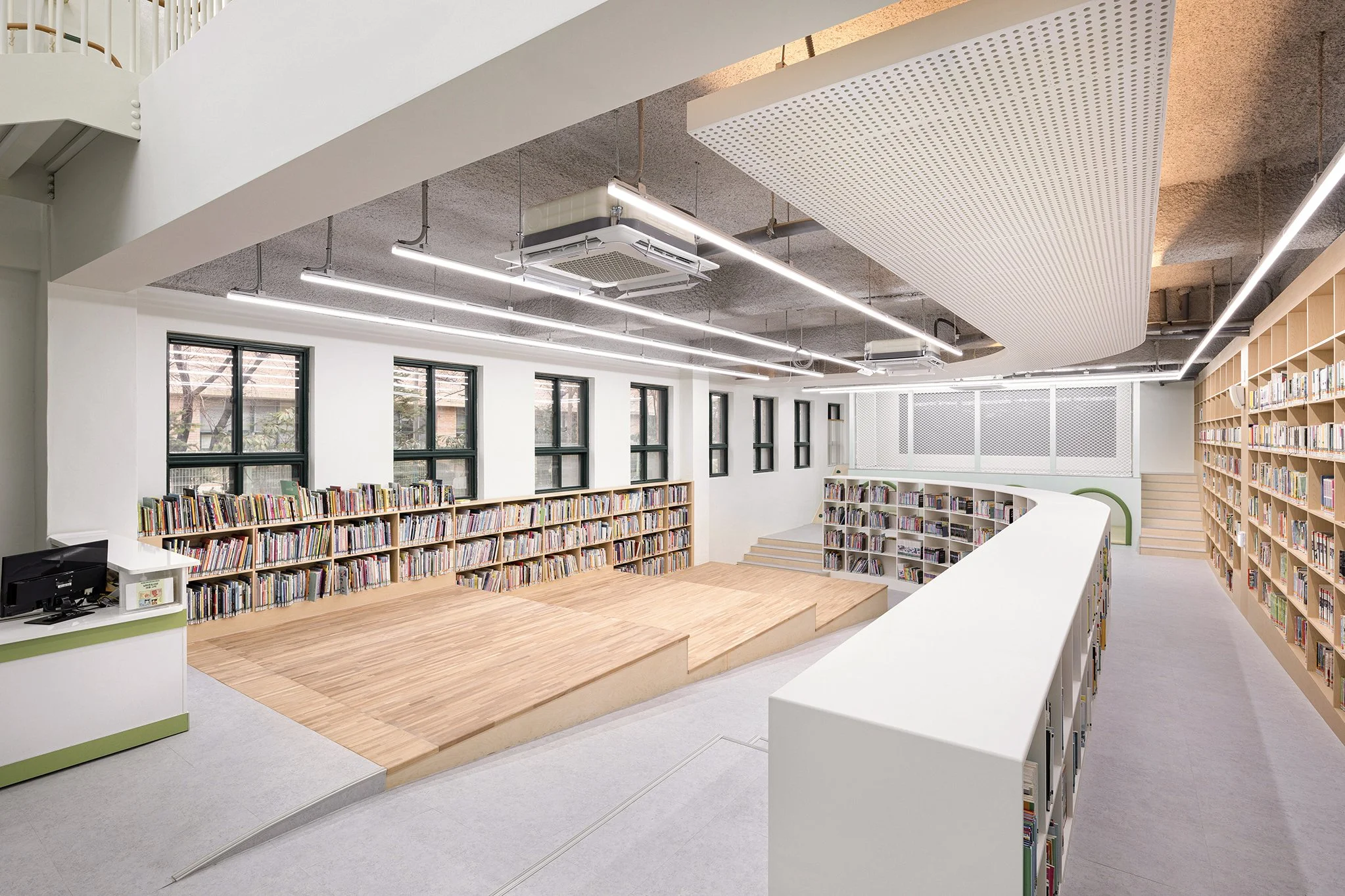 본 프로젝트는 공간의 재구조화와 단계적 확장 가능성을 주요 설계 전략으로 설정하였다. 학교 측은 향후 북측에 위치한 2층 교실들을 순차적으로 철거하여 도서관을 점진적으로 확장하고자 하는 계획을 가지고 있었다. 이에 제한된 공사비 내에서 1·2층을 관통하는 개방 공간을 조성하고 내부 계단을 설치하여 수직적 연결성을 확보하였다.
